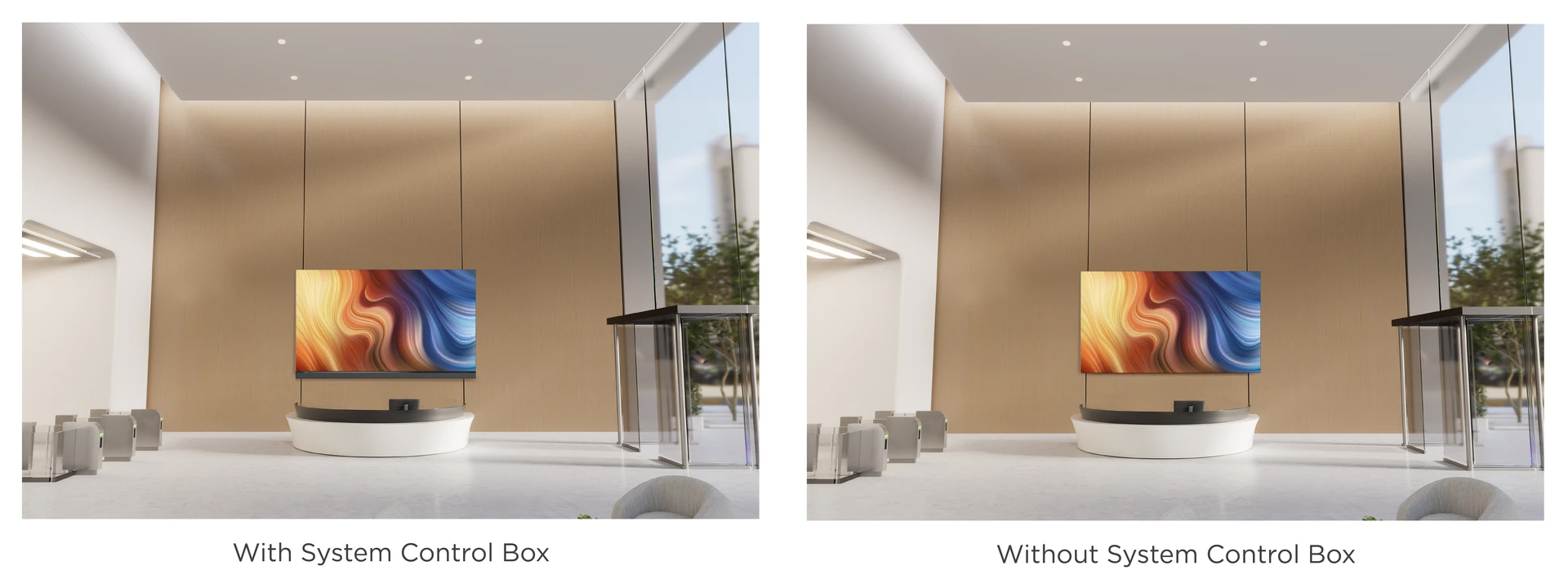 Bộ điều khiển hệ thống có thể dễ dàng tách rời khỏi màn hình LED, tối ưu hóa tỷ lệ hiển thị lên đến 99%, giúp màn hình hòa quyện hoàn hảo với mọi thiết kế nội thất. Ngoài ra, bộ điều khiển có thể đặt cách màn hình lên đến 10 mét, mang lại sự linh hoạt tối đa trong việc truy cập và thao tác.