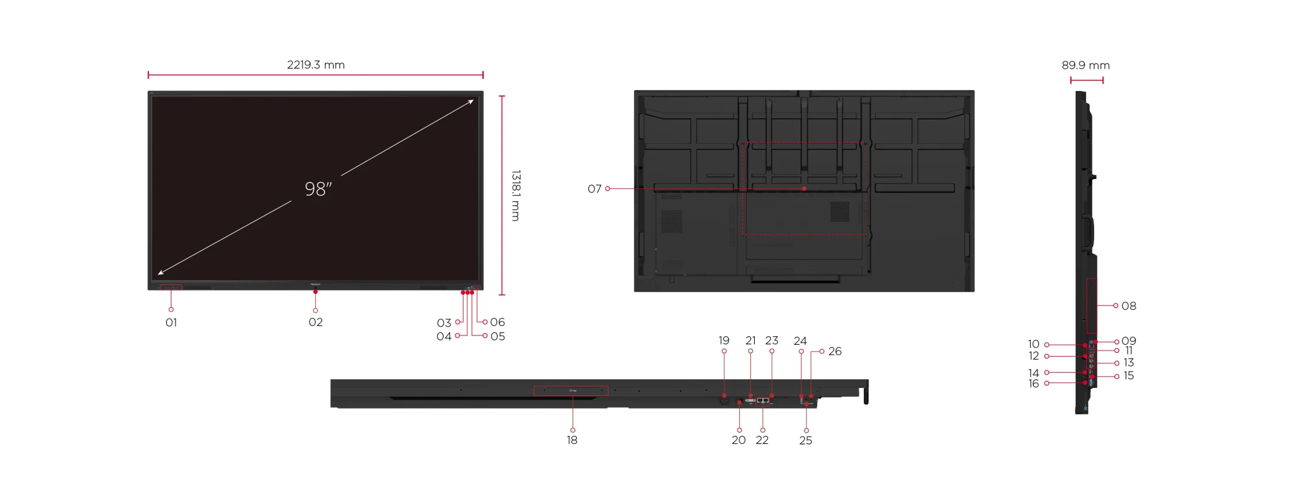 Màn hình 98 inch độ phân giải UHD 3840 x 2160, trang bị đầy đủ các cổng HDMI, USB, LAN, Audio cùng hệ thống kết nối hiện đại, đáp ứng nhu cầu giảng dạy và trình chiếu chuyên nghiệp.